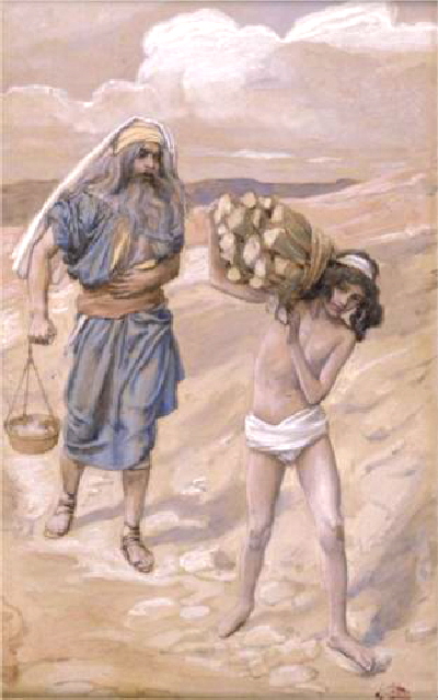Abraham and Sarah dearly loved their son Isaac, and now Abraham was to offer him as a sacrifice to the Lord. The people in the country that Abraham came from, and the people of Canaan about him, thought that their gods were pleased with such a sacrifice, and Abraham knew no better. You will see how the Lord taught him that it is right to be faithful and willing in obeying the Lord, no matter how how hard it is, but He did not let him kill his son. We see the old man Abraham and Isaac with two young men and the ass taking the path from the pastures up into the hills, by the old home at Hebron, to the land of Moriah. It was probably the hill of Moriah, which stands across the Kidron valley from the Mount of Olives, the same hill on which the temple at Jerusalem was afterwards built.