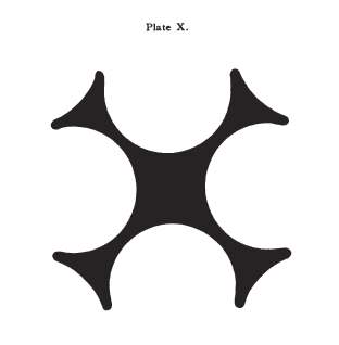 Plate VIII represents nine molecules of water, the central molecule being the first to yield to the pressure. As its envelope, composed of fifth finites, must be the first to give way, its substance will pass into the adjacent interstitial spaces, shown in plate IX, and the adjoining round water molecules settling closer in upon the crushed and yielding particle, it will be pressed into the shape shown in plate X ; this shape will be composed of a central cubic block, consisting of the nuclear core of the original water particle, — a cubic block, therefore, of metallic primitives. At each angle of this central cube will be a tetrahedron block, formed of the fifth finites from the surface of the compressed particle of water. This cubic block, Swedenborg terms an alkaline particle; the tetrahedral blocks are acid particles. Therefore the primeval sea salt, as a compound of both forms, the alkaline and the acid, is basic.