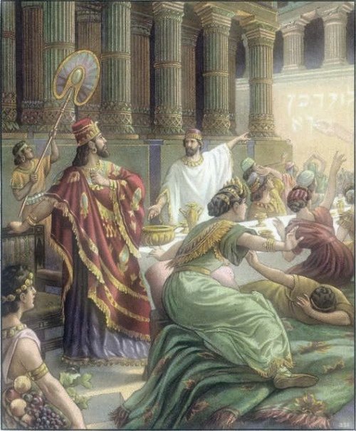 Belshazzar the king made a great feast to a thousand of his lords, and drank wine before the thousand. Belshazzar, whiles he tasted the wine, commanded to bring the golden and silver vessels which his father Nebuchadnezzar had taken out of the temple which was in Jerusalem; that the king, and his princes, his wives, and his concubines, might drink therein. Then they brought the golden vessels that were taken out of the temple of the house of God which was at Jerusalem; and the king, and his princes, his wives, and his concubines, drank in them. They drank wine, and praised the gods of gold, and of silver, of brass, of iron, of wood, and of stone. In the same hour came forth fingers of a man’s hand, and wrote over against the candlestick upon the plaister of the wall of the king’s palace: and the king saw the part of the hand that wrote. Then the king’s countenance was changed, and his thoughts troubled him, so that the joints of his loins were loosed, and his knees smote one against another. The king cried aloud to bring in the astrologers, the Chaldeans, and the soothsayers. And the king spake, and said to the wise men of Babylon, Whosoever shall read this writing, and shew me the interpretation thereof, shall be clothed with scarlet, and have a chain of gold about his neck, and shall be the third ruler in the kingdom. Then came in all the king’s wise men: but they could not read the writing, nor make known to the king the interpretation thereof. Then was king Belshazzar greatly troubled, and his countenance was changed in him, and his lords were astonied. Now the queen by reason of the words of the king and his lords came into the banquet house: and the queen spake and said, O king, live for ever: let not thy thoughts trouble thee, nor let thy countenance be changed: There is a man in thy kingdom, in whom is the spirit of the holy gods; and in the days of thy father light and understanding and wisdom, like the wisdom of the gods, was found in him; whom the king Nebuchadnezzar thy father, the king, I say, thy father, made master of the magicians, astrologers, Chaldeans, andsoothsayers; Forasmuch as an excellent spirit, and knowledge, and understanding, interpreting of dreams, and shewing of hard sentences, and dissolving of doubts, were found in the same Daniel, whom the king named Belteshazzar: now let Daniel be called, and he will shew the interpretation.