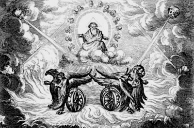And I looked, and behold, a whirlwind came out of the North, a great cloud, and a fire infolding itself, and a brightness about it; and out of the midst thereof as the color of amber, out of the midst of the fire. And out of the midst thereof, the likeness of four living creatures. And this was their appearance; they had the likeness of a man. And everyone had four faces, and everyone had four wings, And their feet were straight feet; and the sole of their feet was like the sole of a calf’s foot: and they sparkled like the color of burnished brass. And they had the hands of a man under their wings on their four sides: and they. four had their faces and their wings. Their wings were joined one to another; they turned not when they went ; they went. everyone straight forward. As for the likeness of their faces, they four had the face of a man, and the face of a lion, on the right side: and they four had the face of an ox on the left side: they four also had the face of an eagle. Thus were their faces; and their wings were stretched upward ; two wings of everyone were joined one to another, and two covered their bodies. And they went everyone straight forward : whither the spirit was to go, they went: and they turned not when they went. As for the likeness of the living creatures, their appearance was like burning coals of fire, like the appearance of lamps: it went up and down among the living creatures; and the fire was bright; and out of the fire went forth lightning. Now, as I beheld the living creatures, behold, one wheel upon the earth, by the living creatures, with their four faces. The appearance of the wheels and their work was like unto the color of a beryl: and they four had one likeness; and their appearance and their work was, as it were, a wheel in the midst of a wheel.-EZEKIEL i. 4-16.