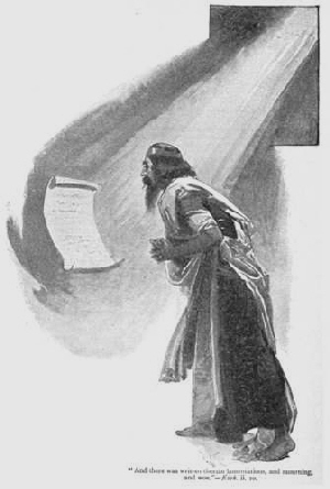 The hand” spread” the book before the prophet; i.e., the Lord revealed His truth to His prophet. The book was written, within and without; i.e., it had an ‘inward and spiritual ‘meaning, and an external and literal sense. And there were written therein, “Lamentations and mourning and woe;” i.e., the spiritual truth reveals the evils and falsities and sins in the inward motives and thoughts of evil men , as well as in their outward conduct. Men lament over the good which they lose. And so, lamentation represents the sorrow which is inseparable from all evil, and in which good is lost. Evil vastates, or lays waste, all the good in the man’s heart, especially when he abuses the letter of the Divine Word, to favor his own evil loves. Then, spiritually, ” evil shall slay the wicked.”