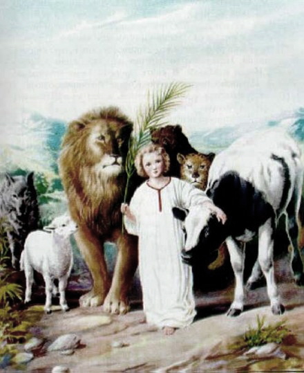 6 And the wolf shall dwell with the lamb; and the leopard shall lie down with the kid; and the calf, and the young lion, and the fatling together; und a little child shall lead them.
