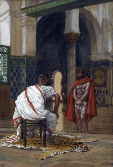 13 When Pilate therefore heard that saying, he brought Jesus forth, and sat down in the judgment-seat, in a place that is called the Pavement, but in the Hebrew, Gabbatha. We have here another of the vacillations of the natural man, the too pliant subject of opposing influences. Pilate again brings forth Jesus, and places him before his enemies, while he himself sits down in the judgment-seat, in the place called the Pavement. This stone-paved place, as the word means, was without the praetorium: and here the judgment-seat was placed in the presence of the Jews. The sentence pronounced from this place ought to have been in accordance with the truth; but stone is the symbol of what is false as well as of what is true, and in this instance its symbolical meaning was too completely verified. The meaning of the Hebrew word for the pavement can only be conjectured: for it may mean either a surface or an elevation, according to the meaning of the two root words, from either of which it may have been derived. But the giving of the Hebrew name as well as the Greek is no doubt intended to teach us that the judgment pronounced upon the Son of man had its ground in the Jewish as well as in the Gentile mind—that the state, represented by the place from which the unjust judgment against the Holy One finally issued, was a state of opposition to the divine truth, both in the church and in the world. Pilate ” sitting down ” in the tribunal is expressive, too, of a more interior and permanent condition of the mind than hitherto, consisting well with the filial decision which was about to be made.