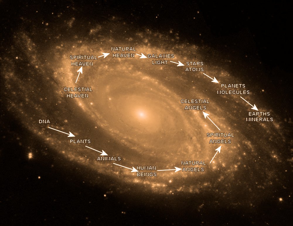 Scientists believe that the Big Bang or initial state of the universe was a singularity. A singularity is where the gravitational field is infinite. And, if we assume that the universe is higher-dimensional, we can infer that the whole universe must be linked to the Infinite by means of curvature, correspondence and influx. Thus, the Infinite or God must be the center and source of all Being. Only God is self-existent; He is Infinite Being itself. In the image above, we can see that the universe and its substances were derived from God’s Substance (Love) and continue to be sustained, maintained and governed by correspondence and influx. Love proceeds or involves from God to produce the Celestial, Spiritual and Natural Heavens. These Heavens are then manifested by correspondence as Galaxies, Stars and Planets. Then Love evolves or returns to God through useful Plants, Animals, Human beings, Natural, Spiritual and Celestial Angels. All existential beings are linked through usefulness. Usefulness produces eternal joy in all creatures and this joy returns to God as Love. And, although the finite and unbounded universe is linked to God through correspondence and influx, God remains transcendent and infinite.