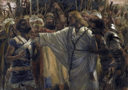 And immediately, while he yet spake, cometh Judas, one of the twelve, and with him a great multitude with swords and staves, from the chief priests and the scribes and the elders. And he that betrayed him had given them a token, saying,Whomsoever I shall kiss, that same is he; take him, and lead him away safely. And as soon as he was come, he goeth straightway to him, and saith, Master, master; and kissed him. And they laid their hands on him, and took him. And one of them that stood by drew a sword, and smote a servant of the high priest, and cut off his ear. And Jesus answered and said unto them, Are ye come out, as against a thief, with swords and with staves to take me? I was daily with you in the temple teaching, and ye took me not: but the scriptures must be fulfilled. And they all forsook him, and fled.—Mark XIV, 32-50.