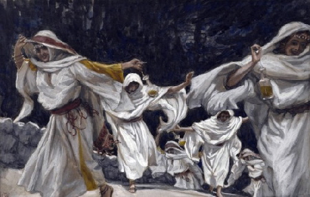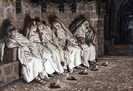 Then shall the kingdom of heaven be likened unto ten virgins, which took their lamps, and went forth to meet the bridegroom.: And five of them were wise, and five were foolish. They that were foolish took their lamps, and took no oil with them: But the wise took oil in their vessels with their lamps. While the bridegroom tarried, they all slumbered and slept. And at midnight there was a cry made, Behold, the bridegroom cometh; go ye out to meet him. Then all those virgins arose, and trimmed their lamps. And the foolish said unto the wise, Give us of your oil; for our lamps are gone out. But the wise answered, saying, Not so; lest there be not enough for us and you: but go ye rather to them that sell, and buy for yourselves. And while they went to buy, the bridegroom came; and they that were ready went in with him to the marriage: and the door was shut. Afterward came also the other virgins, saying, Lord, Lord, open to us. But he answered and said, Verily I say unto you, I know you not. Watch therefore, for ye know neither the day nor the hour wherein the Son of man cometh.—Matthew XXV. 1-13.