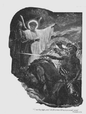 It seemed hard to the Jews,. to live in distress while the heathen nations were living at ease. And this is more or less the case, always, in the life-struggles of human beings, in the search for spiritual life. While the church remains in the material world, it must meet the sensuous conditions of this world; and it must come into conflict with such states. Our natural minds are seeking natural peace and ease, even while our interior minds are seeking the spiritual peace and rest which come with regeneration, in goodness, truth, and righteousness. And while we are longing for success in our mental conflict, our Lord will sometimes open our minds, by means of His holy Word, and will give us a glimpse of existing conditions in the world of our own sensuous natural mind, He will show us the angel of Truth, occupying the representative horse of our intellect, and standing in the myrtle grove, the rational thoughts of our minds. And we shall recognize our own different conditions of understanding, some red, some speckled, and some white; mental conditions in which we sometimes attempt to understand the Lord’s Word from selfish and evil loves, or from mixed truths and self-derived notions, or in the deadly whiteness, or paleness, of a lack of spiritual life.